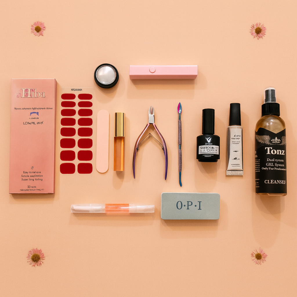 پک ویژه حرفه ای (شامل استیکر انتخابی، دستگاه یووی قلمی شارژی کوچک ، تاپ کات ، قلم ریموور ، چسب استیکر ، نیپر ، عقبزن ، کلینزر ، پودر کروم ، براش سیلیکونی، پولیش ناخن)